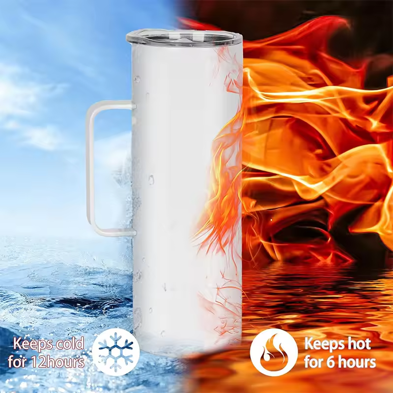 Under normal temperature, the sleek skinny tumbler with handle can keep your Drink icy-cold for 8 hours or your coffee and tea hot for over 6 hours. Nice temperature retention, great quality and modern design make the sublimation tumbler a must-have accessory of every family. Perfect for outdoor parties, or just for cozy nights at home.